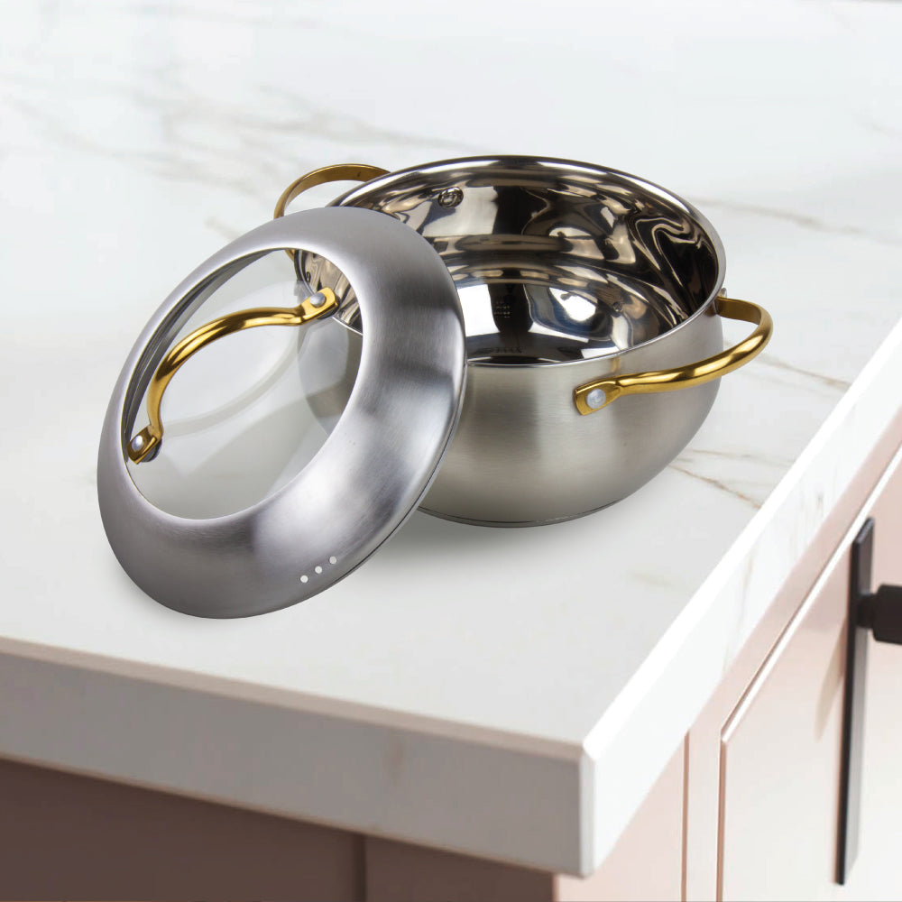 Create delicious meals with a stainless steel cookware set that not only comes in a stunning, eye-catching design but delivers exceptional cooking results time after time. Including 4 Stockpots, a saucepan and a saute pan, The SQ Professional Stainless Steel Lustro Apple 6pc Cookware Set covers all your culinary needs.