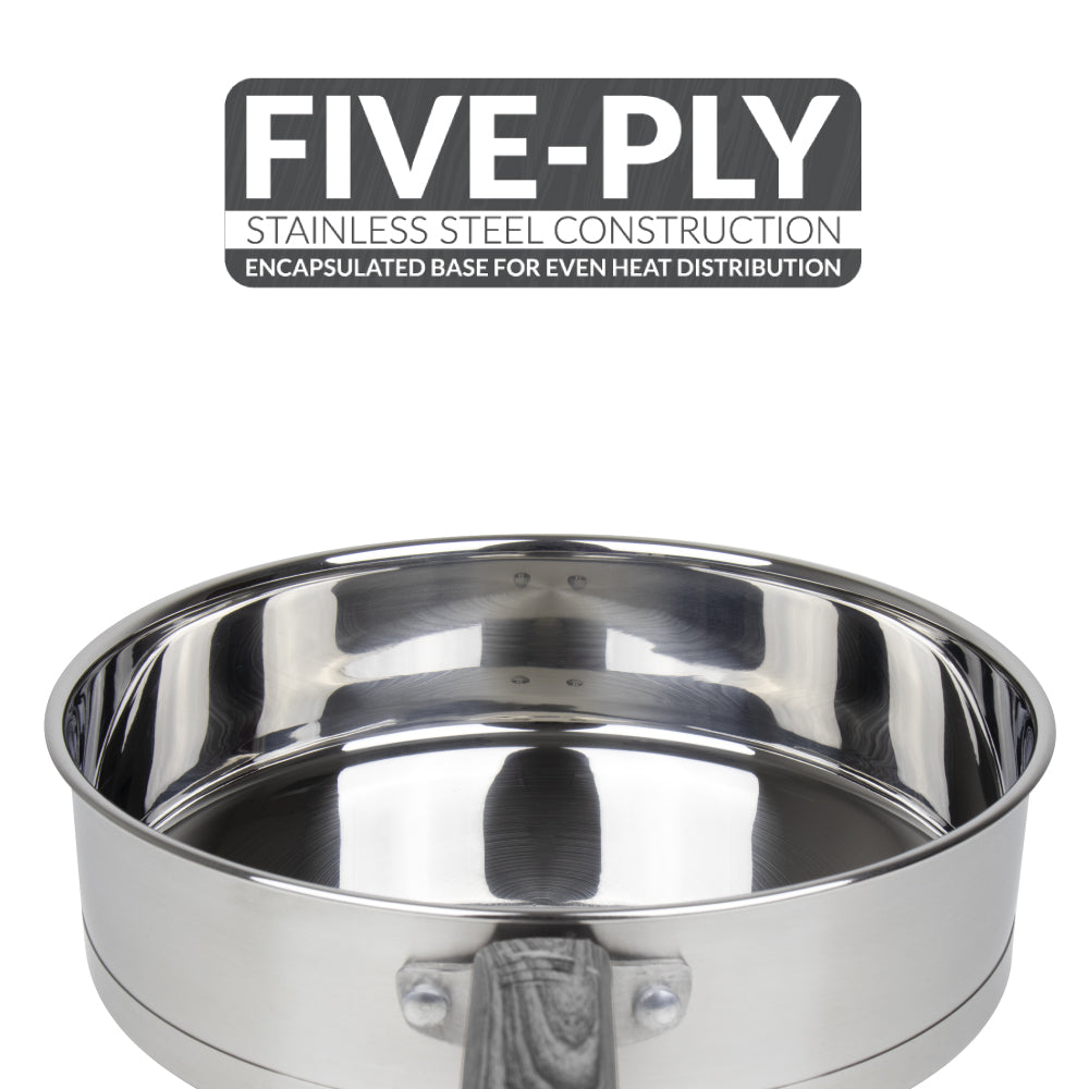 constructed from 5 layers of engineered metals to achieve the very best cooking results, including aluminium for optimal heat distribution and a ferrous core for efficient induction cooking and heat retention.
