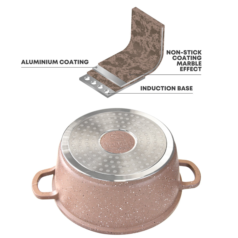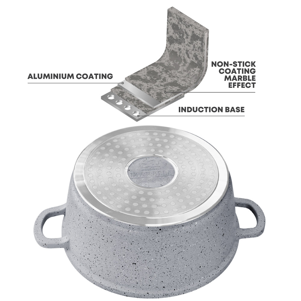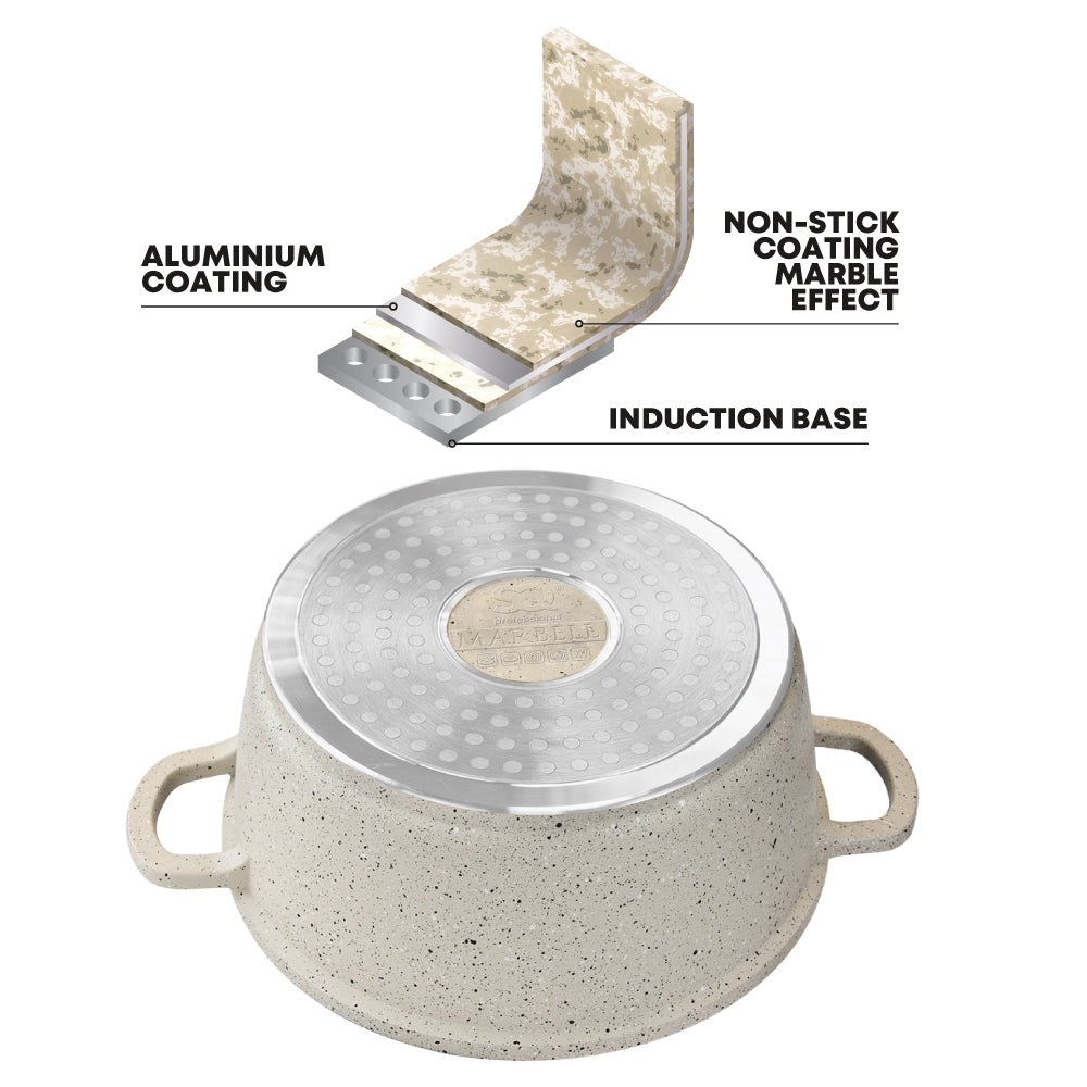 CARE: The outstanding non stick performance of the Marbell coating in this die-cast stock pot set eliminates effort in washing up as food remnants can easily be wiped from the surface.