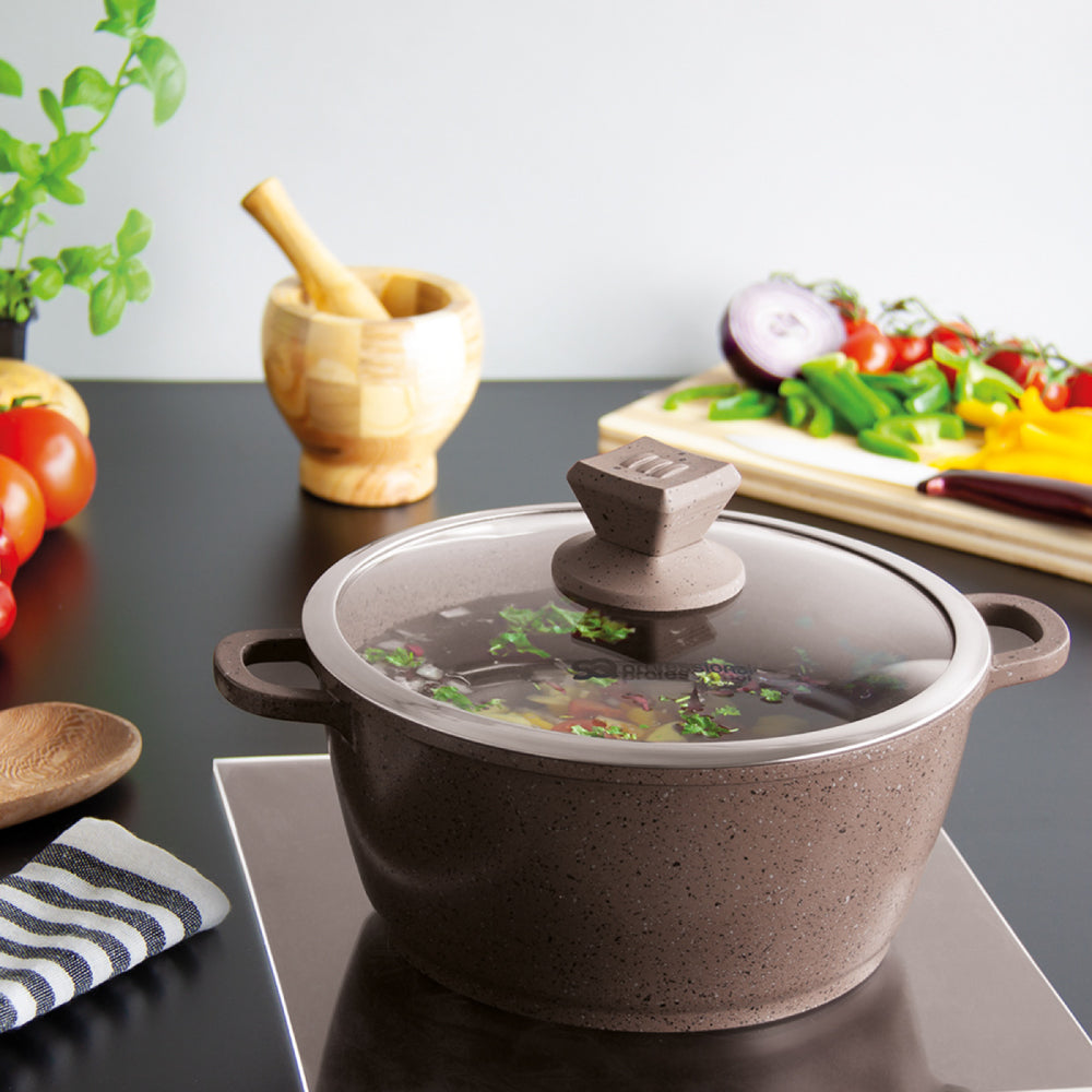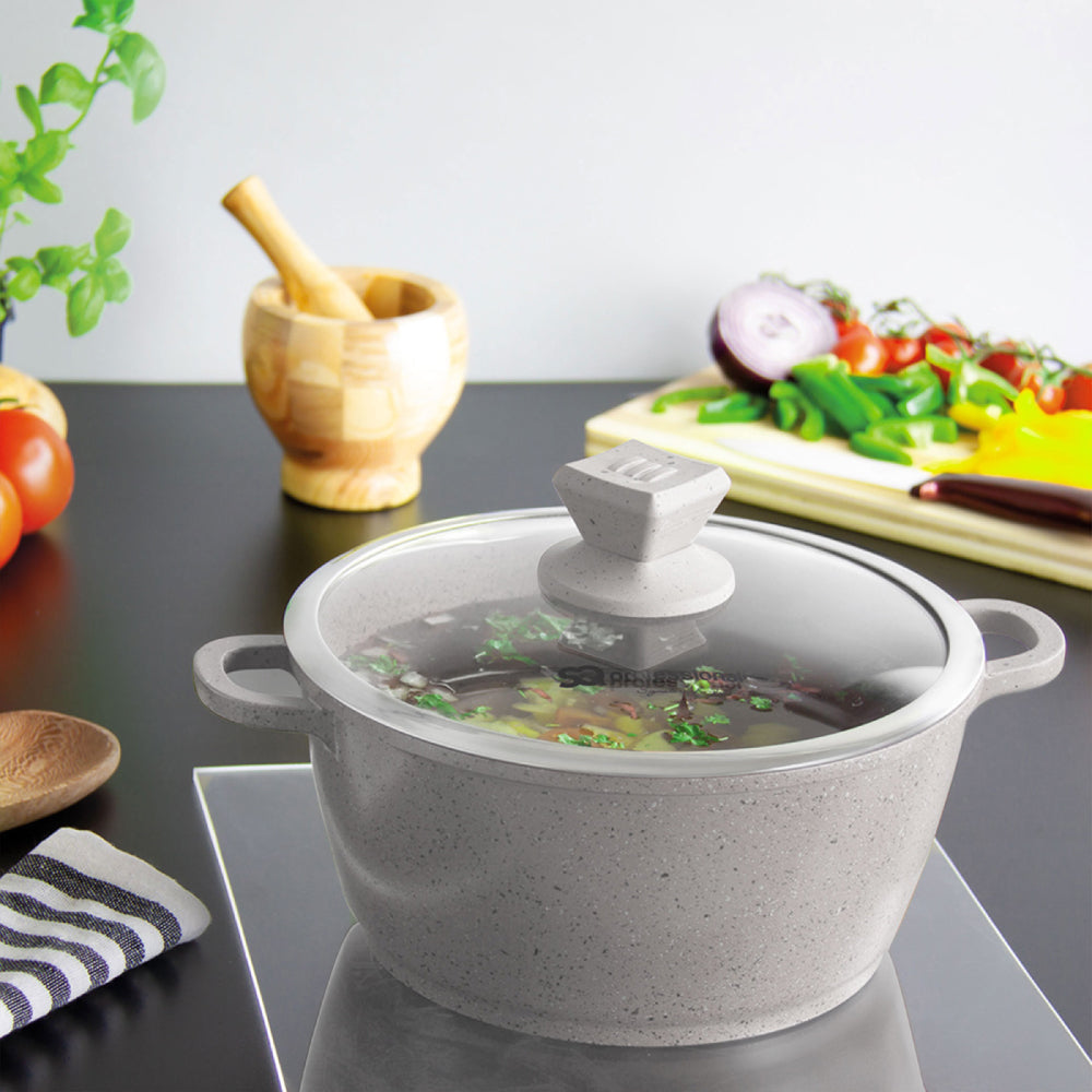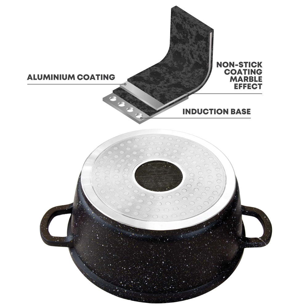 MANUFACTURE: Manufactured from premium die-cast aluminium, the interiors of this cookware set are finished in a high-quality durable marble effect non stick coating, allowing you to cook more healthily while not having to compromise on flavour and succulence. These stock pots are constructed specially to retain heat and distribute it evenly throughout the cooking process, avoiding hotspots. The practical transparent tempered glass lid with steam vent lock in flavour and nutrients, while allowing you to monitor the progress of your cooking. The stock pots are finished with robust side handles and knobs, designed for comfort and safe handling during use.