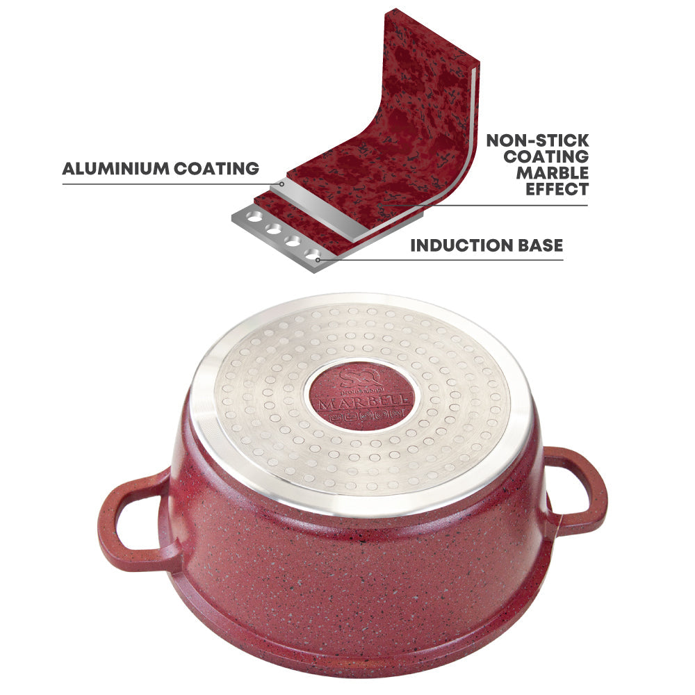 CARE: The outstanding non stick performance of the marble coating in this die-cast stock pot set eliminates effort in washing up as food remnants can easily be wiped from the surface.